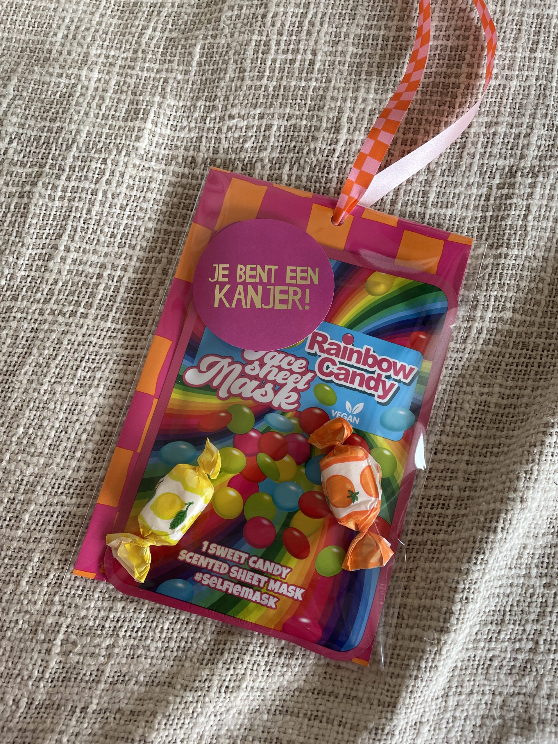 Dit masker wordt met een paar snoepjes verpakt en voorzien van een handig lint om om de nek te dragen tijdens het defilé.